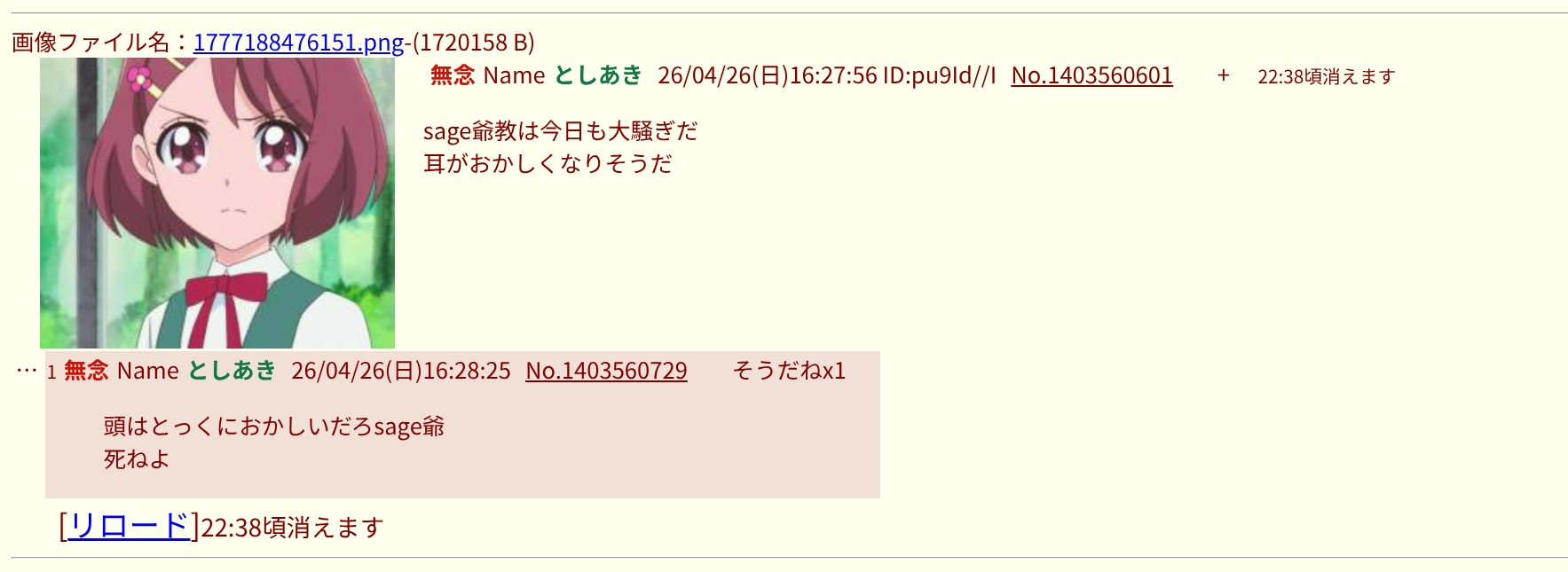 | … | 38無念Nameとしあき26/04/26(日)15:00:13 ID:IJXwrahQNo.1403539423そうだねx2>健全sage爺だけはぜったいにゆるさないよ |