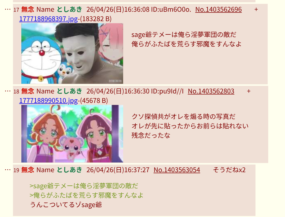 | … | 21無念Nameとしあき26/04/26(日)13:22:16 ID:8wz9JvjsNo.1403519164そうだねx3>淫夢虫のプロバイダ(新語録開発) |