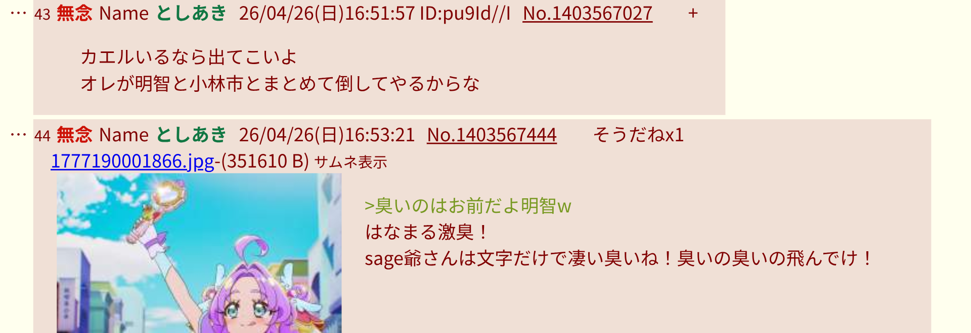 | … | 41無念Nameとしあき26/04/26(日)15:23:34 ID:4n0Tfy0ENo.1403544609そうだねx6>うんこガノタン^〜 |
