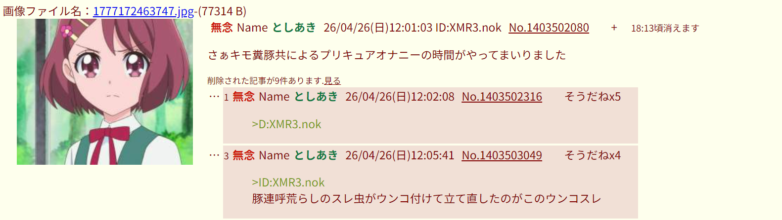 | … | 5無念Nameとしあき26/04/26(日)12:55:25 ID:RCxiR6bcNo.1403513399+書き込みをした人によって削除されました |
