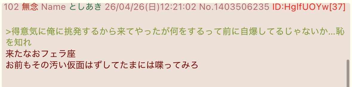 | … | 43無念Nameとしあき26/04/26(日)15:38:54 ID:8wz9JvjsNo.1403548546そうだねx1>sage爺定型文以外の事いうと馬鹿だってバレちゃうんだよ❤️ |