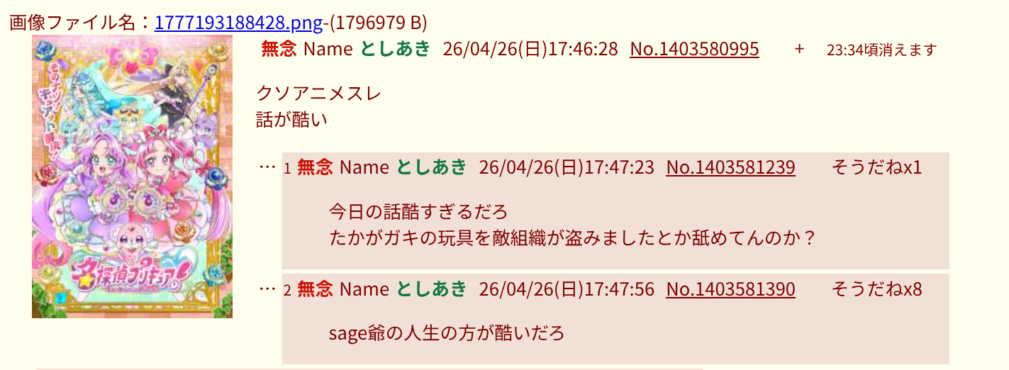| … | 56無念Nameとしあき26/04/26(日)17:01:02 ID:l8/V1JxwNo.1403569408そうだねx3 1777190462888.jpg-(465430 B) IDでまくっててしょーもな |