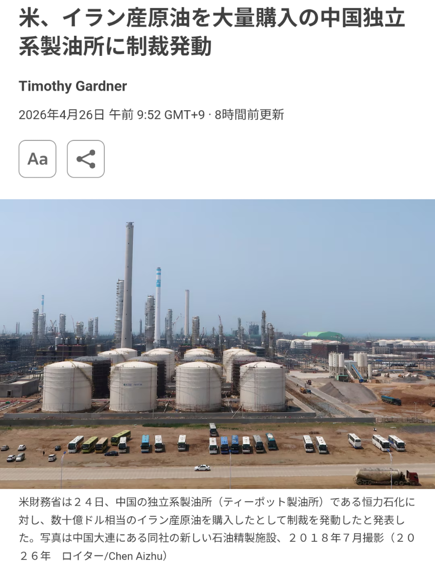 | … | 116無念Nameとしあき26/04/26(日)21:01:41No.1403635881そうだねx1中国が戦狼外交で高市内閣を支援していたのに薄情だな |