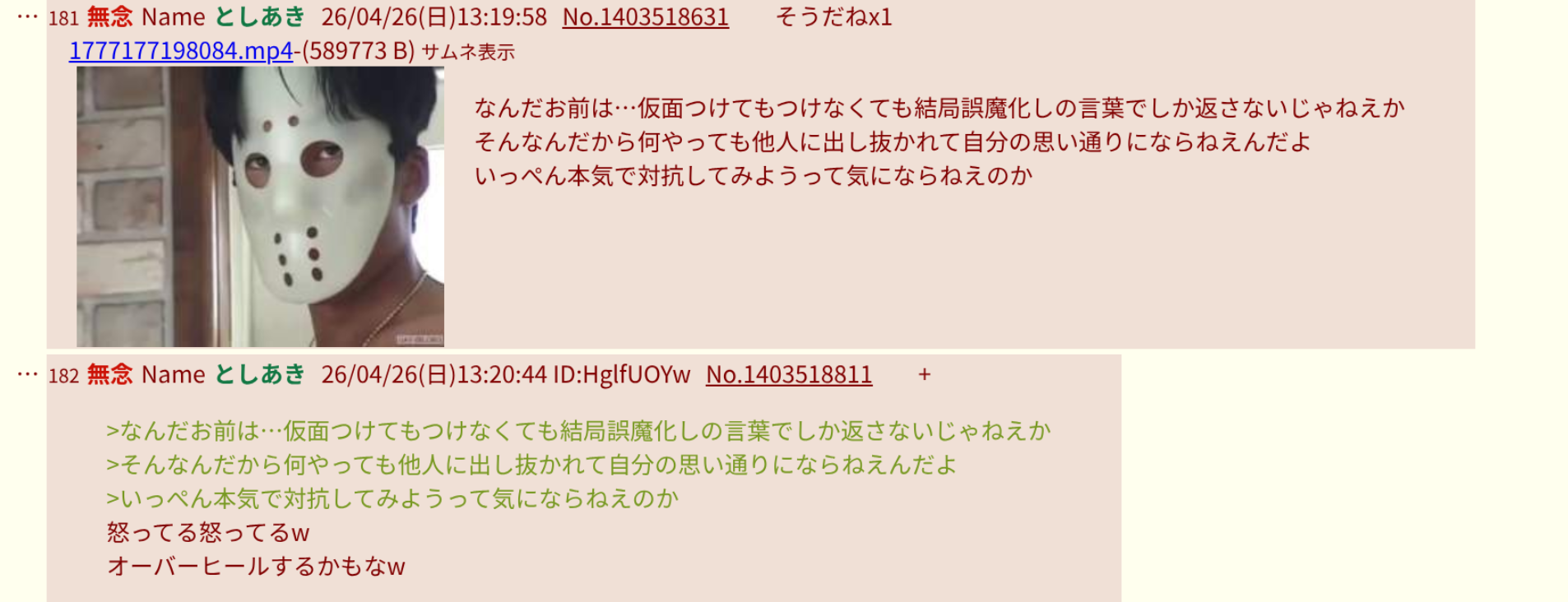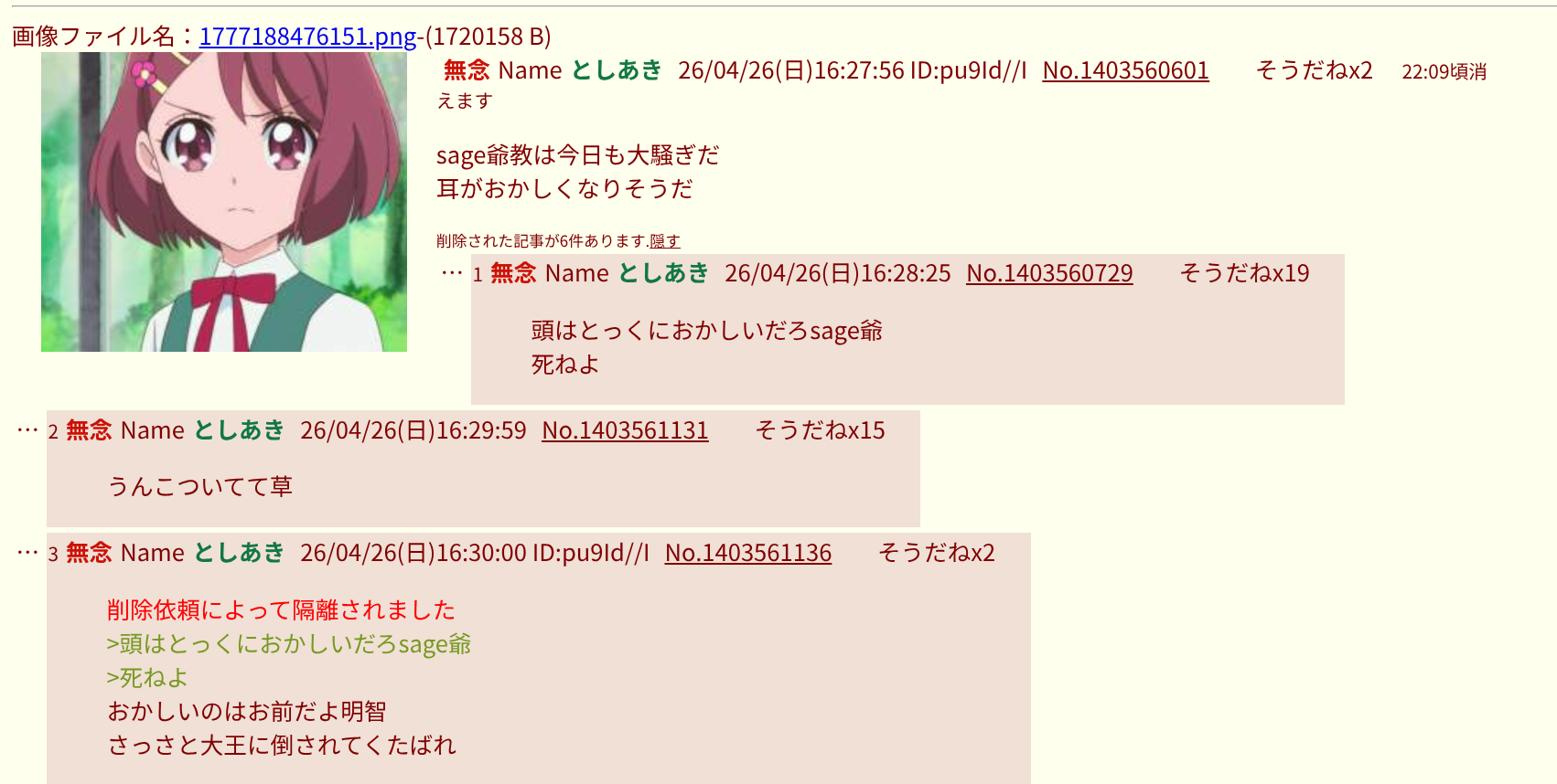 | … | 34無念Nameとしあき26/04/26(日)19:09:45No.1403603009そうだねx4スレあきがナシナシで立ててくれたおかげで「👴アラシテヤル(idモロ出汁)」が口だけだってわかる |