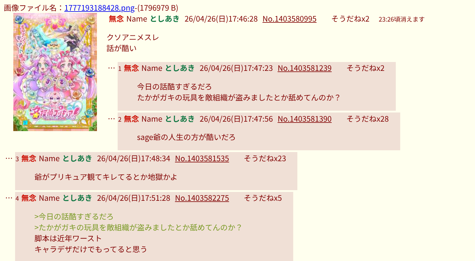 | … | 13無念Nameとしあき26/04/26(日)18:27:53No.1403591952そうだねx7 1777195673959.png-(580911 B) クソアニメスレ |