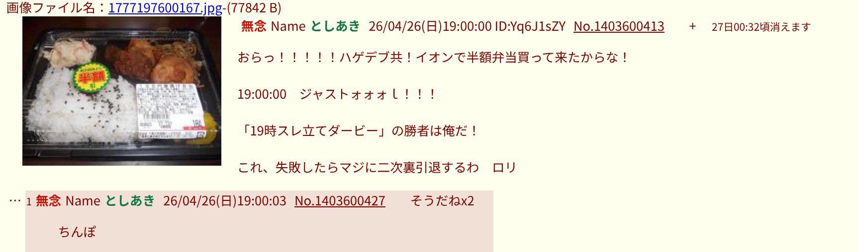 | … | 16無念Nameとしあき26/04/26(日)18:30:09No.1403592560そうだねx7>そういえば今日は弁当スレでも暴れてたゾ |