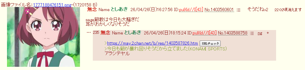 | … | 49無念Nameとしあき26/04/26(日)19:32:32No.1403609198+書き込みをした人によって削除されました |