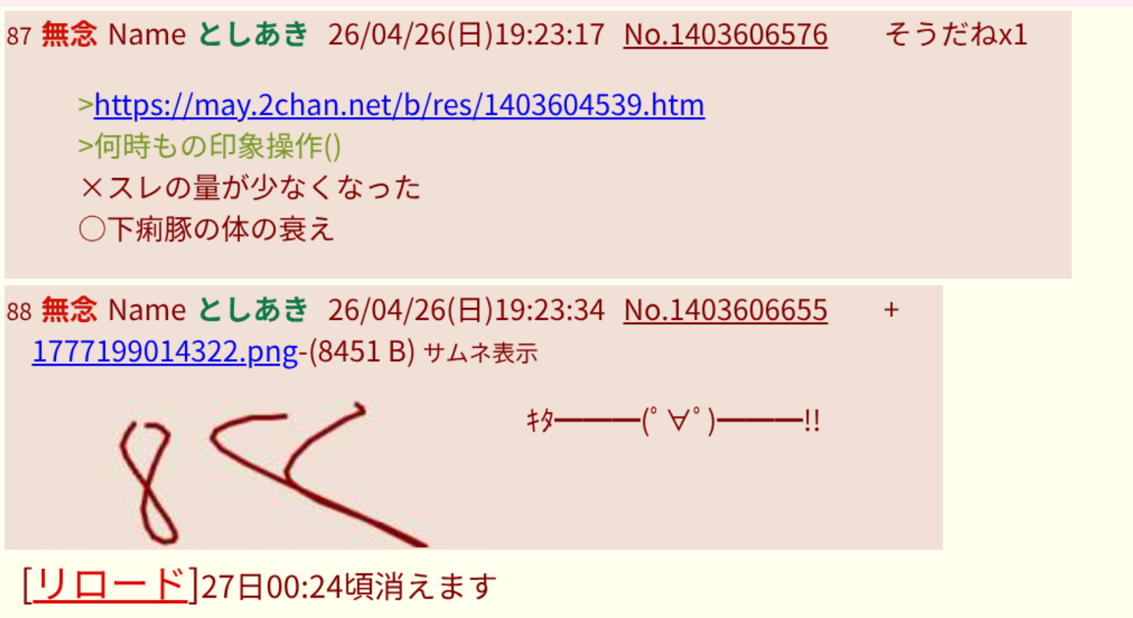| … | 47無念Nameとしあき26/04/26(日)19:31:31No.1403608892そうだねx2>キリ番ごっこしてました…(小声) |