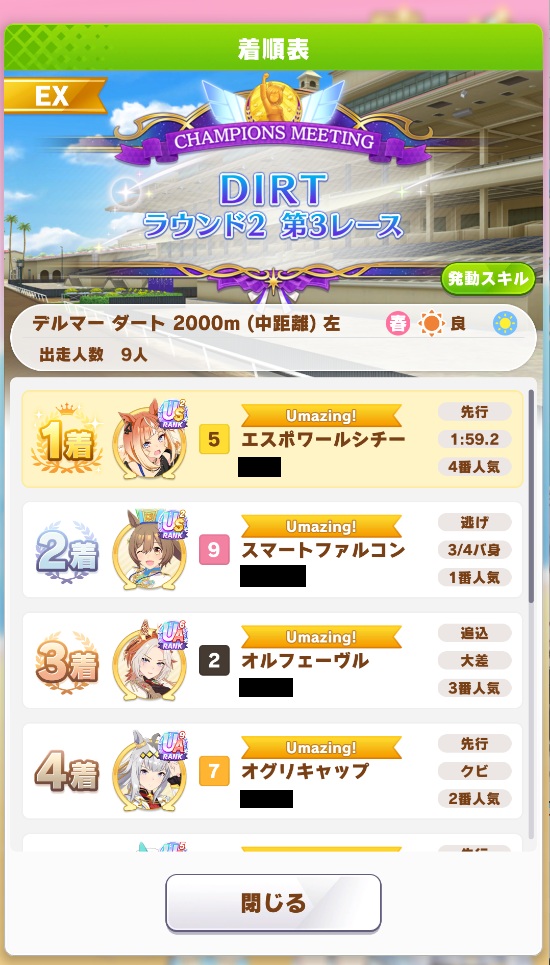 | … | 129無念Nameとしあき26/04/26(日)20:51:15No.1403632743そうだねx1逃げでスタ1200足らずでもデバフ刺さっても全然いけるぞ今回 |