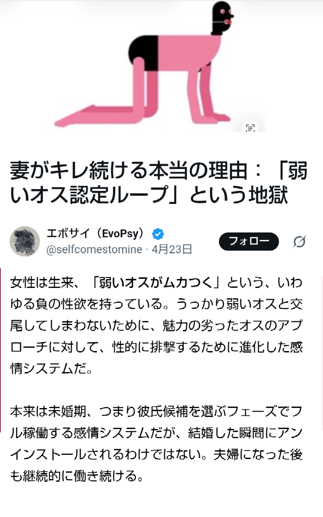 | … | 65無念Nameとしあき26/04/27(月)09:35:39No.1403724959そうだねx1よくよく考えるとヒトの女性って生物的には非力な筈なのに |