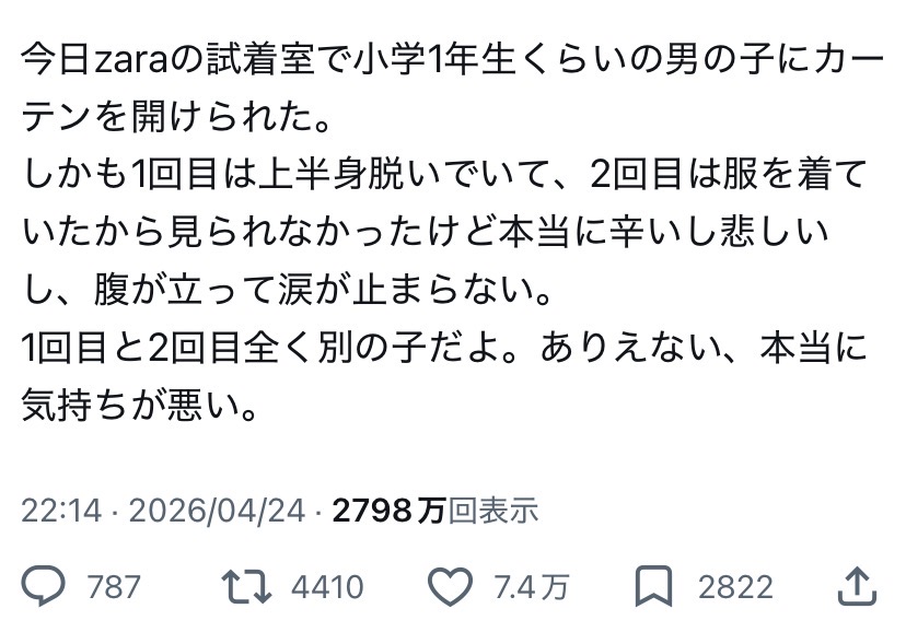 | … | 139無念Nameとしあき26/04/27(月)10:30:16No.1403730472そうだねx3>今日zaraの試着室で小学1年生くらいの男の子にカーテンを開けられた。 |