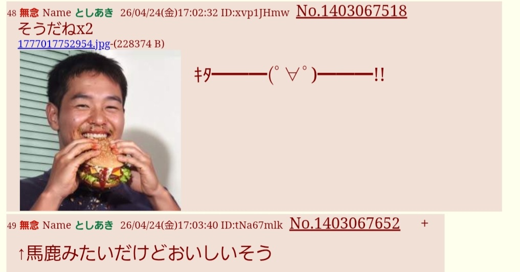 | … | 17無念Nameとしあき26/04/27(月)11:44:25No.1403738826そうだねx8 1777257865453.jpg-(87982 B) sage爺、ハンバーガーを食べるやじゅたんに欲情してしまう…。 |