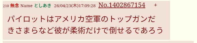 | … | 47無念Nameとしあき26/04/27(月)12:56:59No.1403751428そうだねx1 1777262219022.jpg-(28856 B) USN「トップガンで空軍入隊者が増えてマジ狂い!」 |