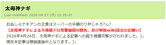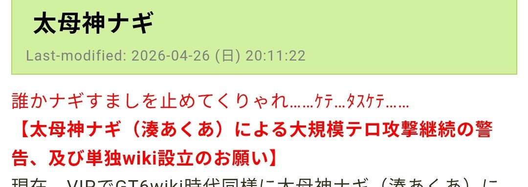 | … | 15無念Nameとしあき26/04/27(月)17:12:20 IP:118.7.*(ocn.ne.jp)No.1403788834そうだねx2>wikiなんてバックアップあるだろうに精神的勝利の為に荒らしたのか |