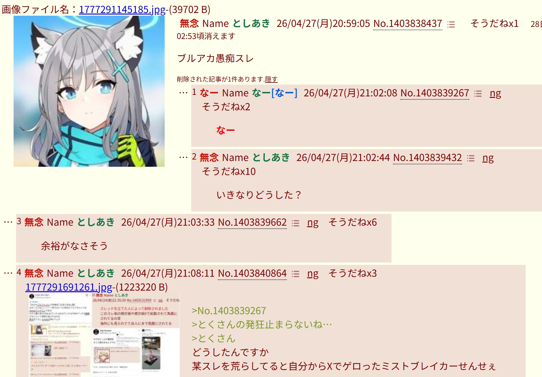 | … | 516無念Nameとしあき26/04/28(火)00:06:25No.1403885765そうだねx3>ホシノ たいない |