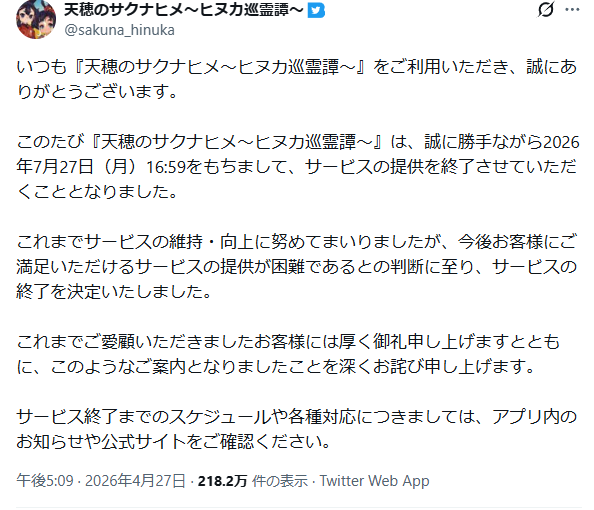 | … | 665無念Nameとしあき26/04/27(月)23:59:12No.1403884507そうだねx1>種もみ爺さんで思い出したけど、サクナヒメのソシャゲもうサ終なんだな |