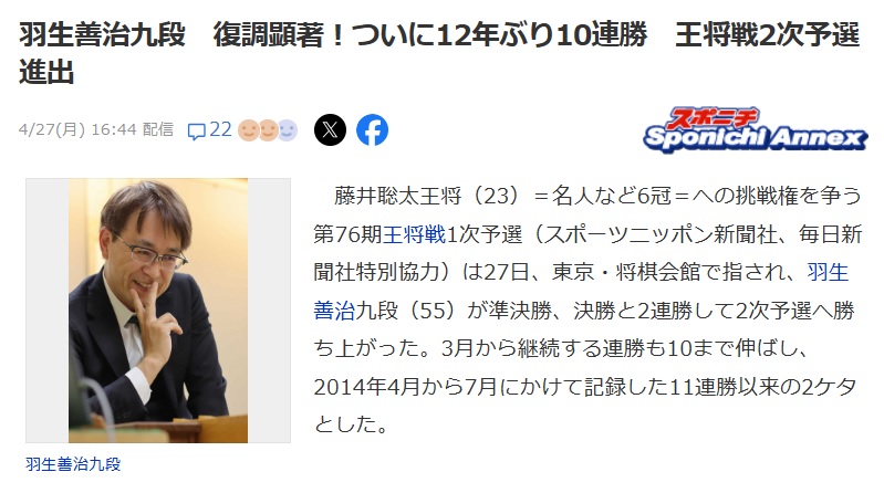 | … | 720無念Nameとしあき26/04/28(火)00:08:44No.1403886141+>将棋連盟の会長やめて将棋だけに集中できるようになったらしい |