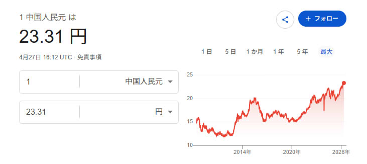 | … | 47無念Nameとしあき26/04/28(火)01:23:30No.1403896663+確か2020年頃は1人民元17円とかだったはず |