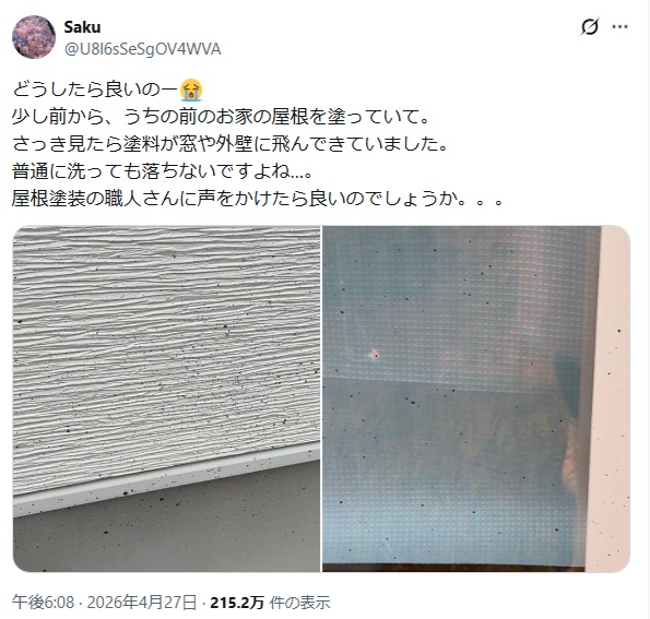 | … | 82無念Nameとしあき26/04/28(火)12:59:01No.1403955736そうだねx2塗料って飛沫が思いの外遠くまで届くからよくあるトラブルなんだよ |
