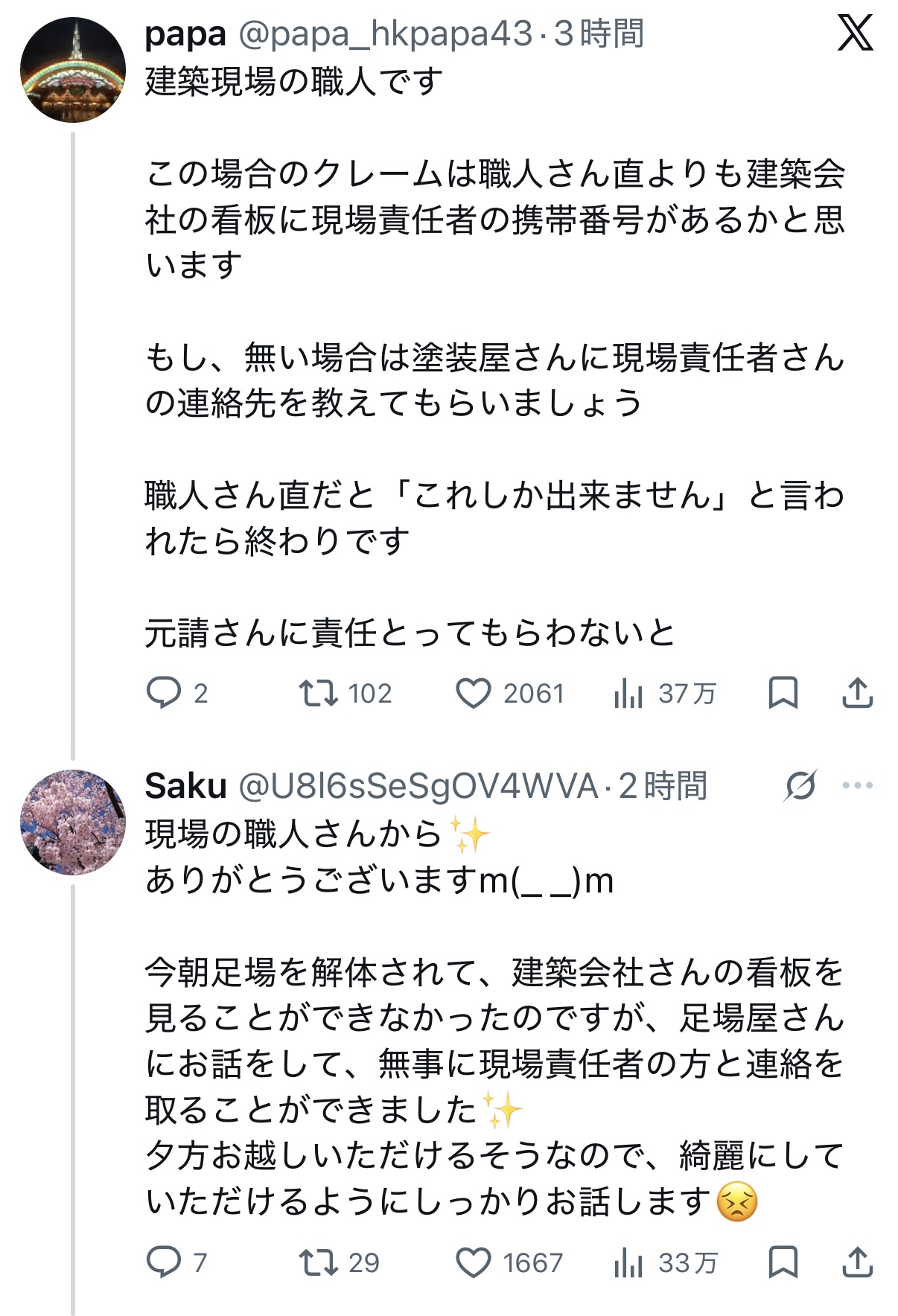 | … | 31無念Nameとしあき26/04/28(火)12:16:14No.1403947091そうだねx4>>>>>隣つっても隣は作業依頼しただけで実行したのは業者だから隣に言っても意味なくね? |