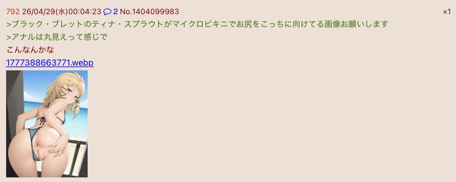 | … | 806無念Nameとしあき26/04/29(水)11:15:15No.1404162299+ 1777428915884.png-(1250559 B) >眠っているラストピリオドのルルナに馬乗りになって巨尻を鷲掴みにして尻コキしているシチュをよろしければお願いします |