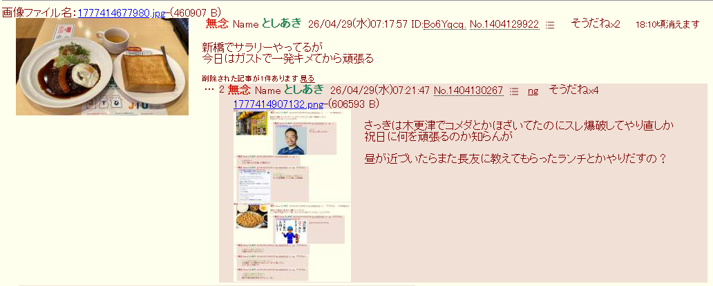 | … | 190無念Nameとしあき26/04/29(水)10:40:22 ID:HUpJc.6INo.1404156207+>川口市で自営業やってるが今日のモーニングはこれにした |