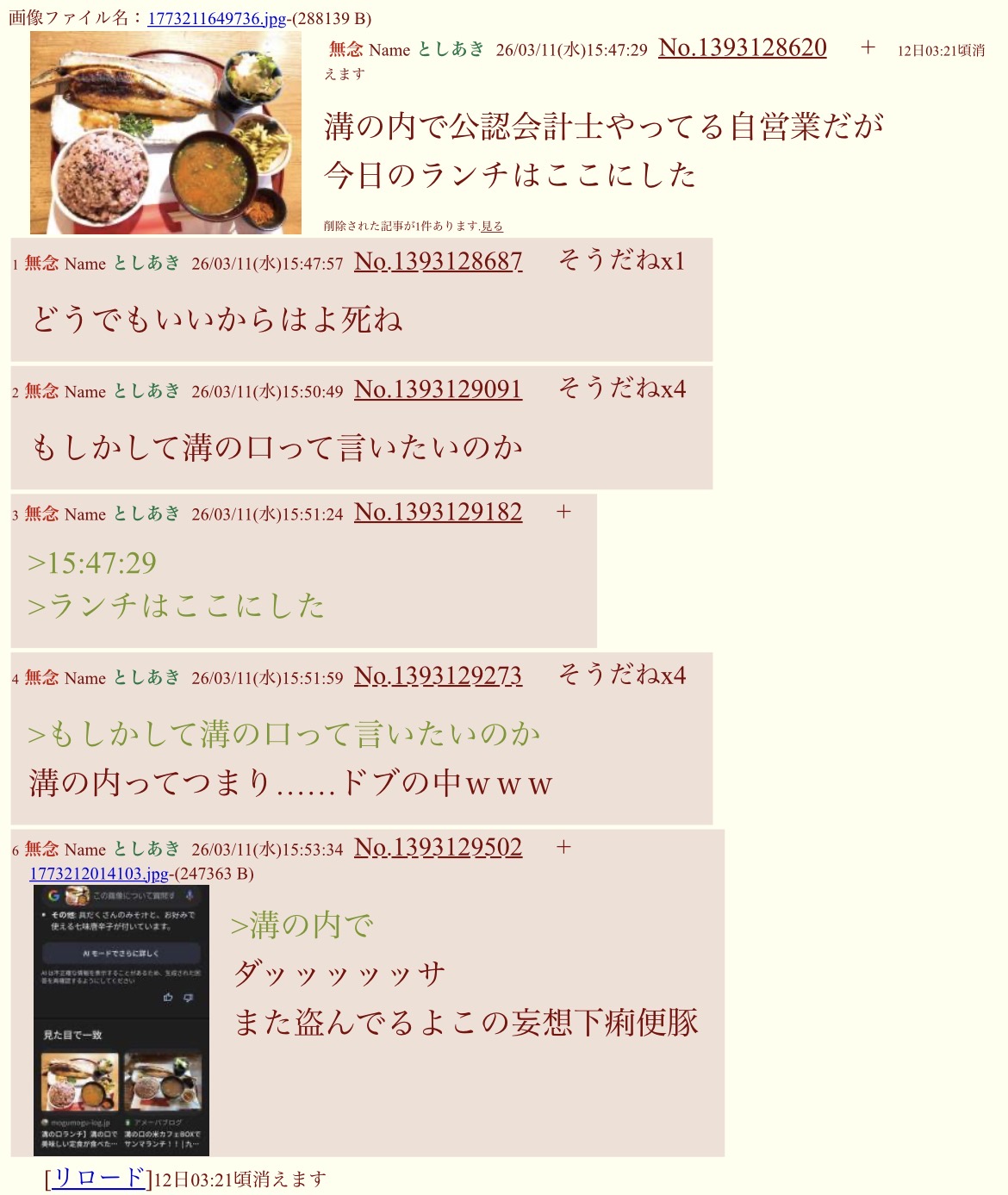 | … | 80無念Nameとしあき26/04/29(水)09:35:45No.1404145613+>なにに答えてそのうどん出したかわかってねぇのか知的障害者 |