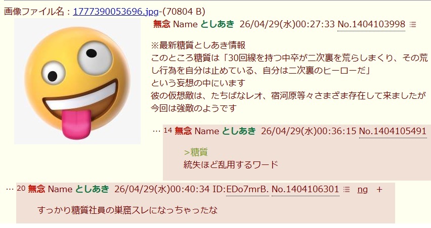 | … | 37無念Nameとしあき26/04/29(水)11:18:41No.1404162923そうだねx3>糖質は造語使いたがるから |