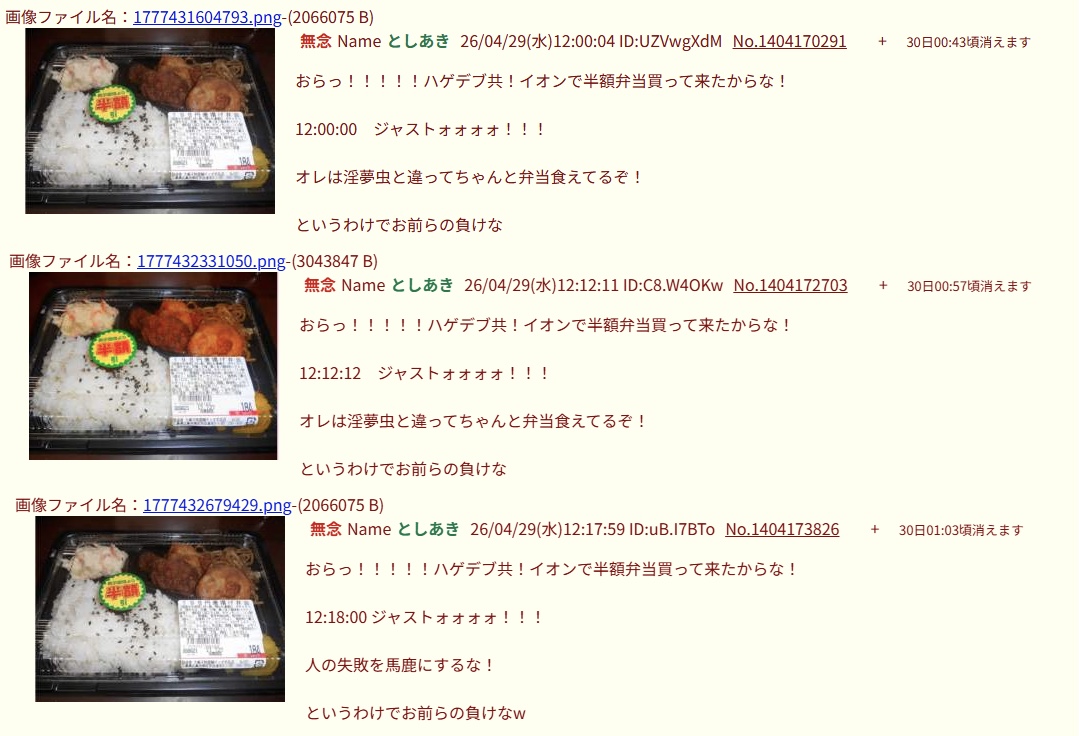 | … | 34無念Nameとしあき26/04/29(水)13:16:15No.1404186499そうだねx6>弁当スレの豚がブリブリ五月蠅いなあ |