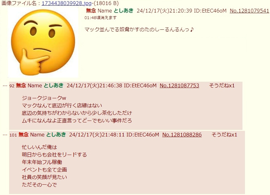 | … | 92無念Nameとしあき26/04/29(水)13:34:50No.1404190385そうだねx5>何か今はTFスレの連中が自分を追いつめてきてると思い込んでるようで |