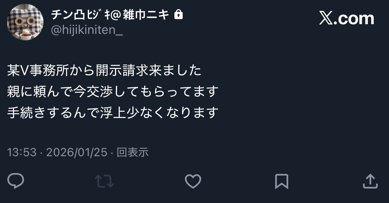 | … | 277無念Nameとしあき26/04/29(水)14:38:23No.1404203681そうだねx3>被害を受けたVチューバーは刑事・民事両方で動いているのを明言してるね |