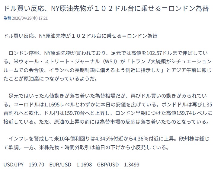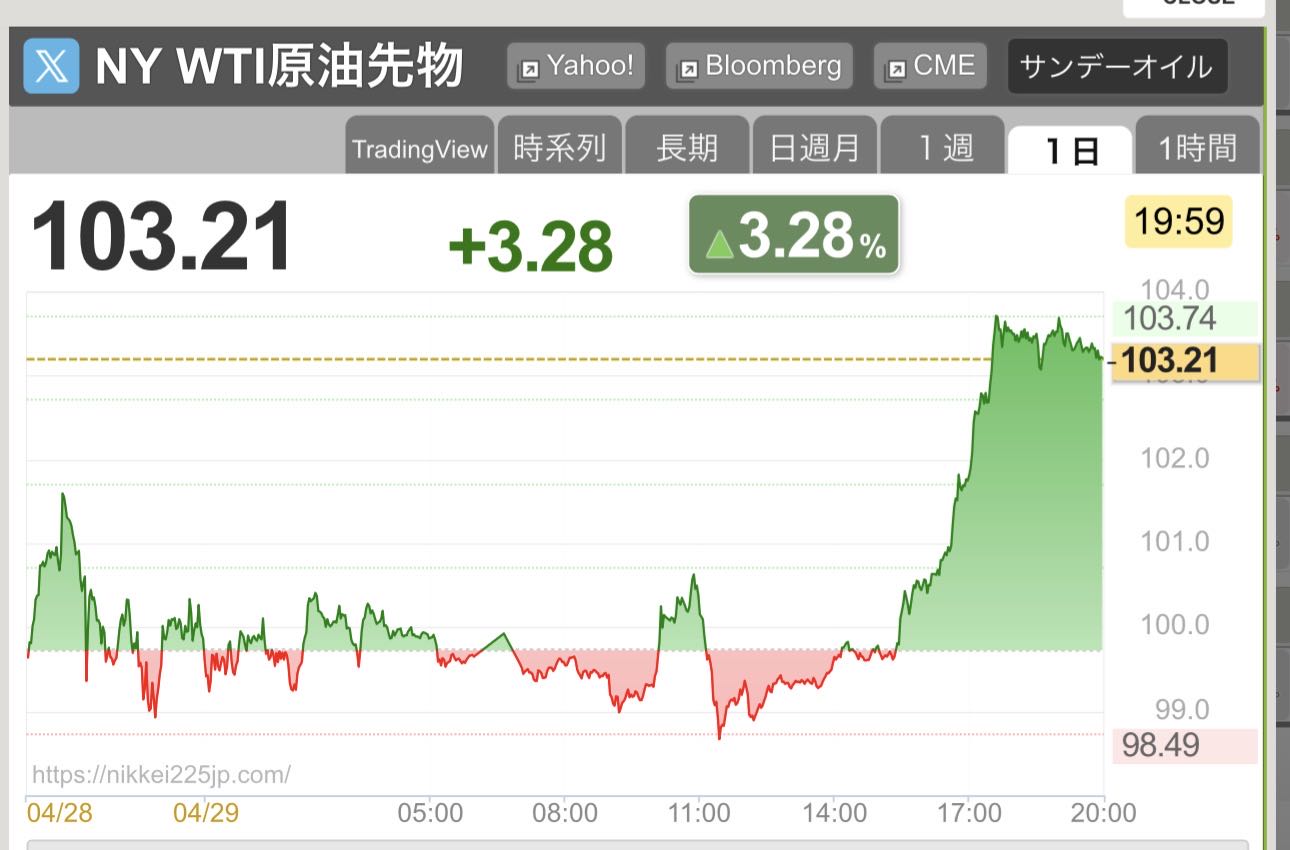 | … | 968無念Nameとしあき26/04/29(水)20:44:38 ID:Sxv5qS72No.1404288713+原油上がりまくりので |