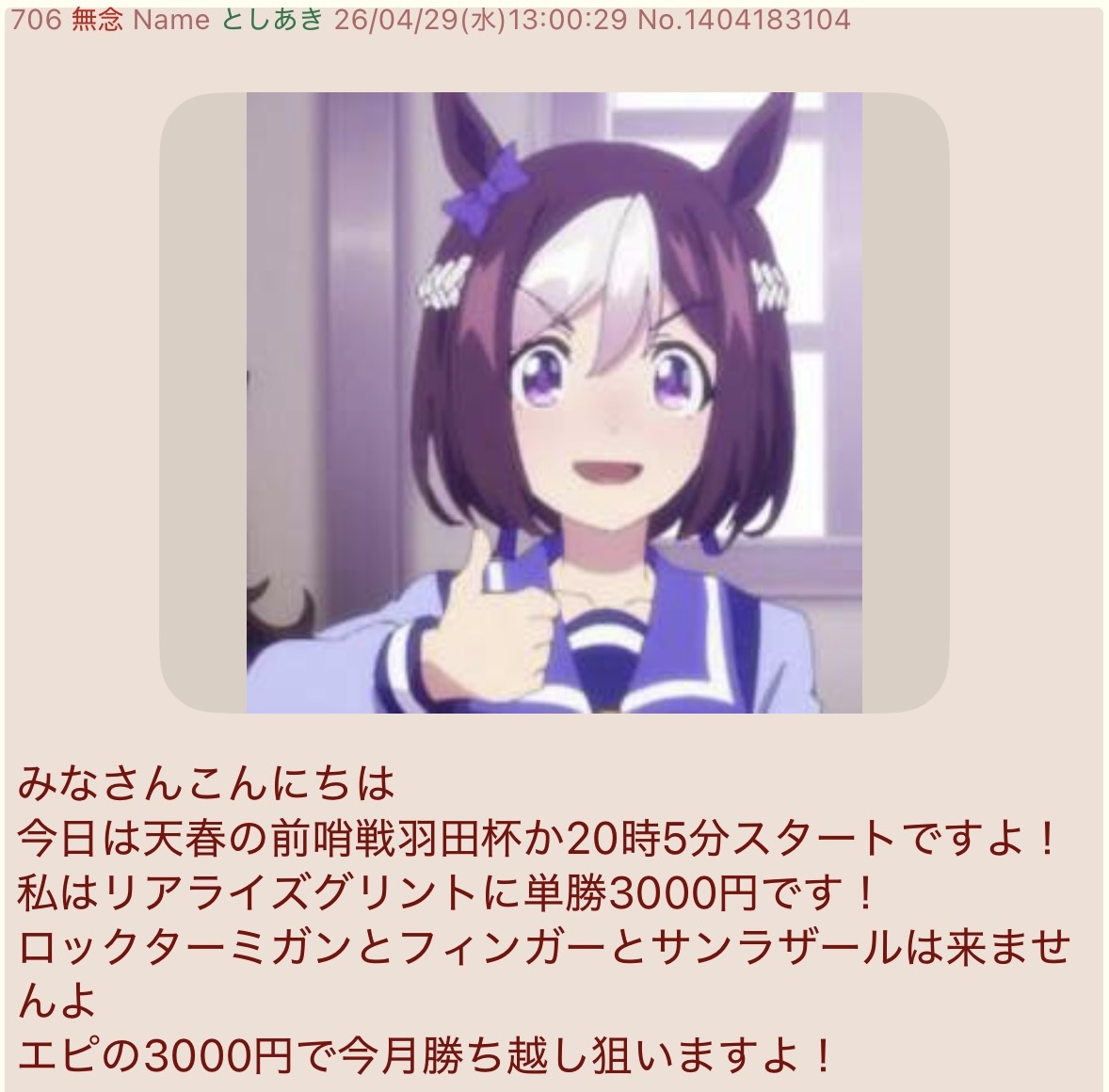 | … | 548無念Nameとしあき26/04/29(水)20:20:17 ID:loUIHgeQNo.1404281950+羽田盃誰が勝ったのかと思ったらタナパク先生のとこのフィンガーでありますか |