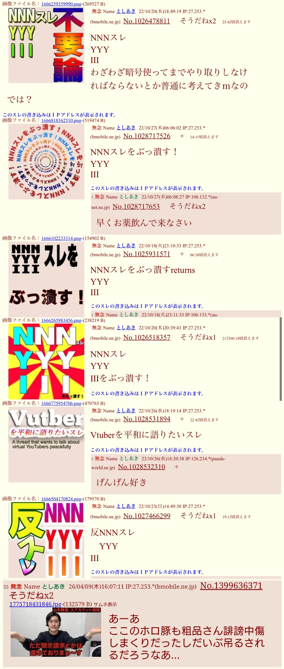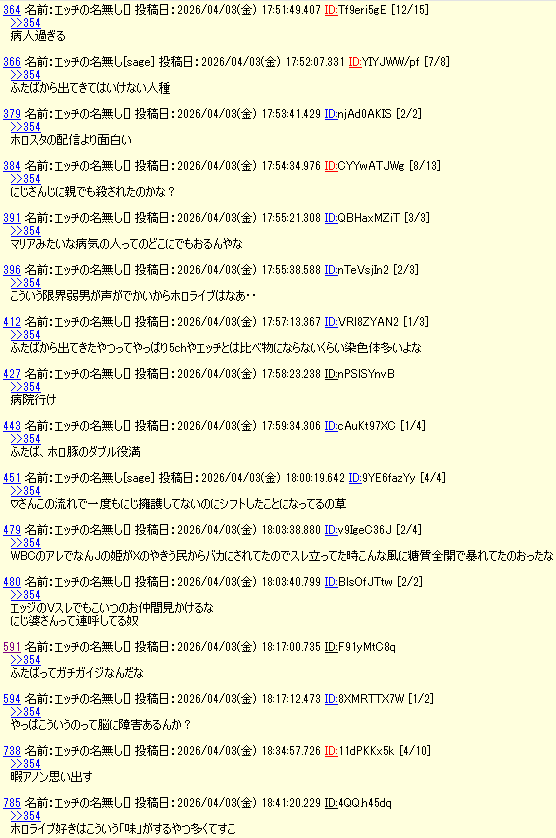 | … | 180無念Nameとしあき26/04/29(水)20:09:53No.1404278997+>にじリスはプロバイダバレたらにじ有のワッチョイからレス照合されるので都合悪くて書き込めないらしい |