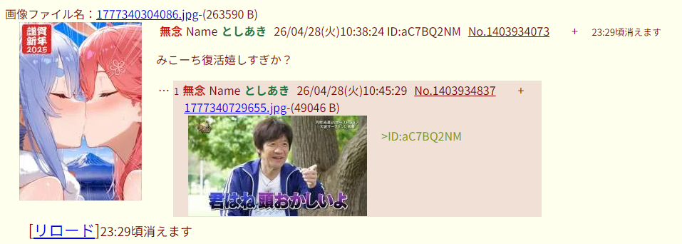 | … | 73無念Nameとしあき26/04/29(水)19:38:49No.1404269968そうだねx2>>ID:fXxtNtbA |