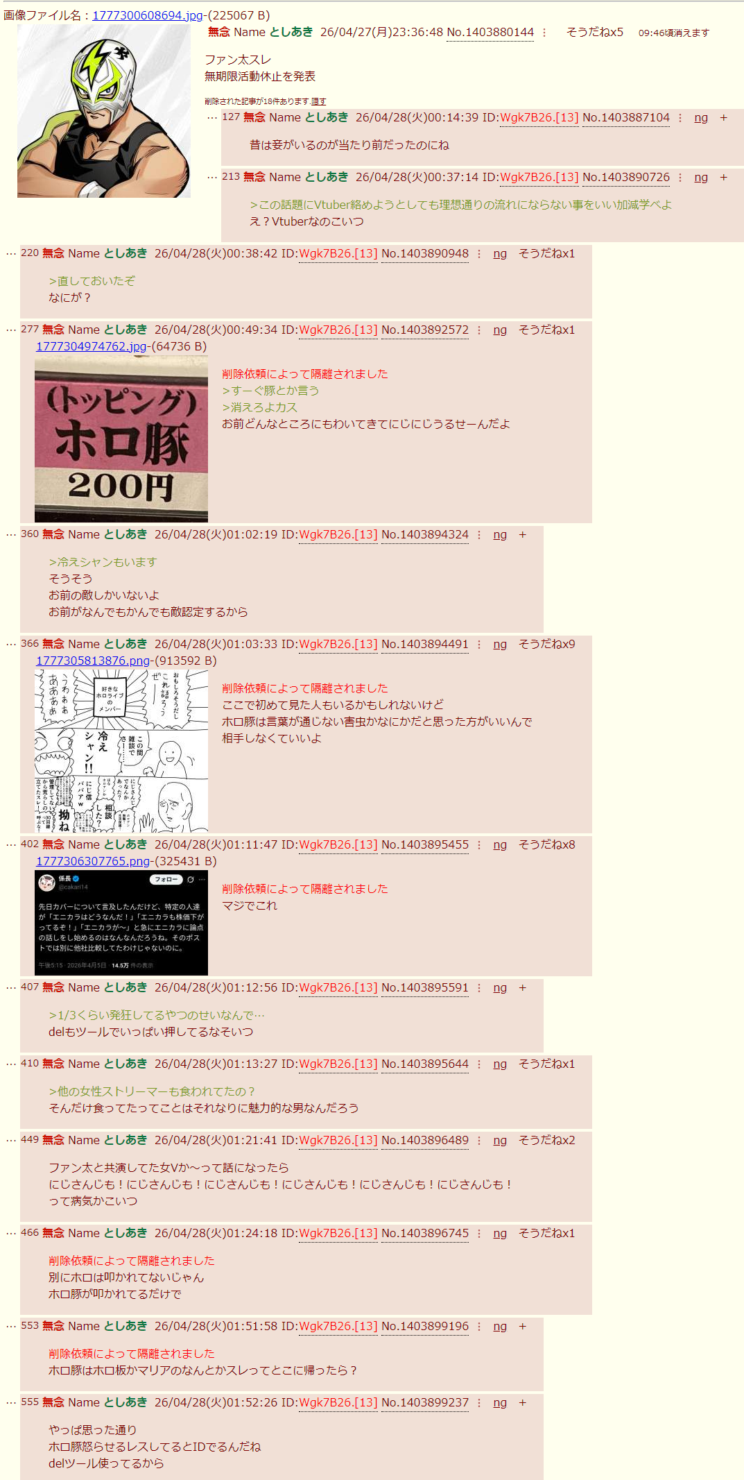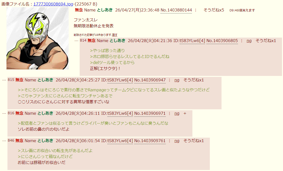 | … | 238無念Nameとしあき26/04/29(水)20:27:26No.1404283874そうだねx1 1777462046224.png-(200027 B) >>ファン太のスレ酷かったね |