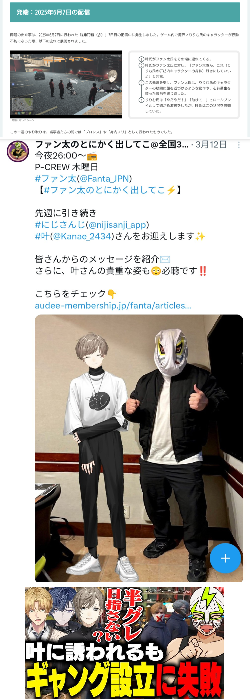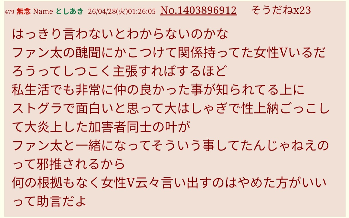 | … | 272無念Nameとしあき26/04/29(水)20:38:42No.1404287034+丁度フジテレビの時と被っててGTAの性上納ごっこで炎上したけど叶の相方のファン太が女性問題起こしたからもっと洒落にならん話題になったわ |