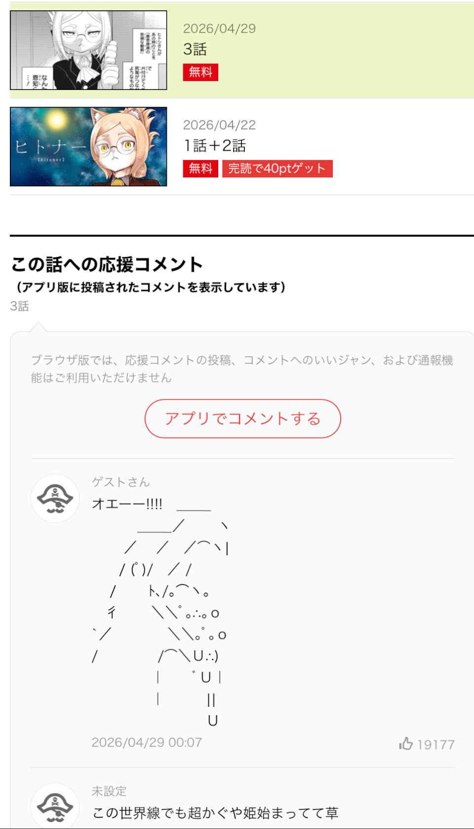 | … | 9無念Nameとしあき26/04/29(水)23:15:27No.1404331179そうだねx57>連載になってつまらなくなったな |