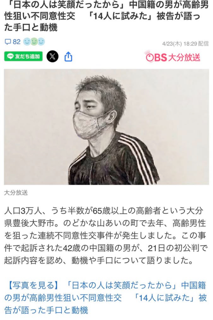 | … | 27無念Nameとしあき26/04/30(木)20:21:10No.1404508950そうだねx9 1777548070401.jpg-(32470 B) >大分県内で70代と80代の男性2人に性的暴行を加えたなどとして、中国籍の42歳男が逮捕されました。今回の逮捕で3回目です。 |