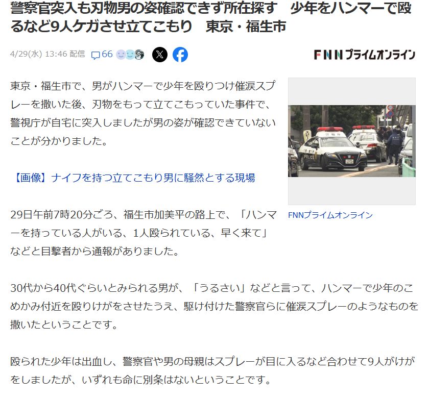 | … | 947無念Nameとしあき26/04/30(木)23:46:35No.1404564530+ 1777560395677.jpg-(154286 B) >29日午前7時18分、「ハンマーを持っている人がいる。 |