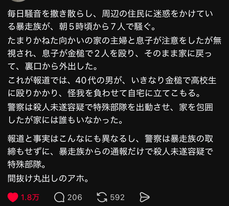 | … | 20無念Nameとしあき26/04/30(木)21:50:35No.1404537060そうだねx181警察に泣きつく暴走族とかダサすぎる |