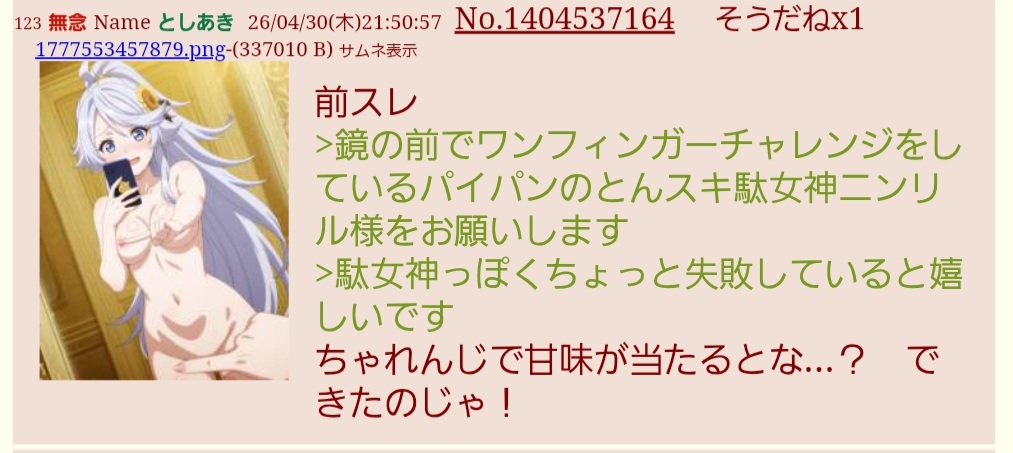 | … | 84無念Nameとしあき26/05/01(金)06:34:02No.1404595022+ 1777584842482.png-(1253356 B) >1000なら露出アスレチックハプニングもあり |