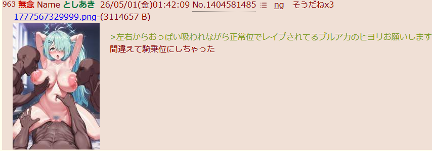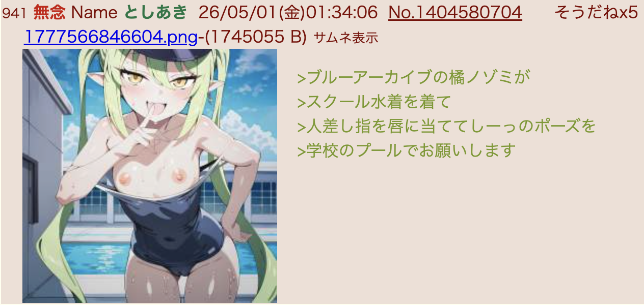 | … | 45無念Nameとしあき26/05/01(金)05:55:01No.1404593101+>>1000なら生成あきの好きなキャラ/状況でくぱぁ祭り |